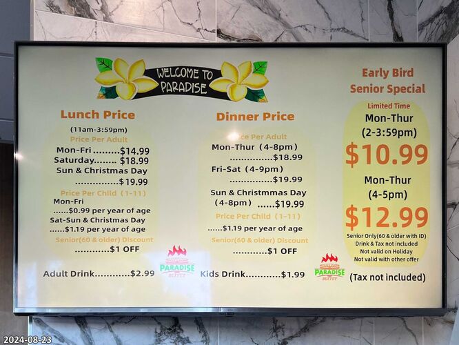 If you're in the Bell, CA area and looking for a satisfying buffet experience, Paradise Buffet Bell at 6257 Atlantic Ave, Bell, CA 90201 is definitely worth a visit. Their menu offers a wide range of pricing options suited to different days and age groups, making it a flexible and family-friendly choice.